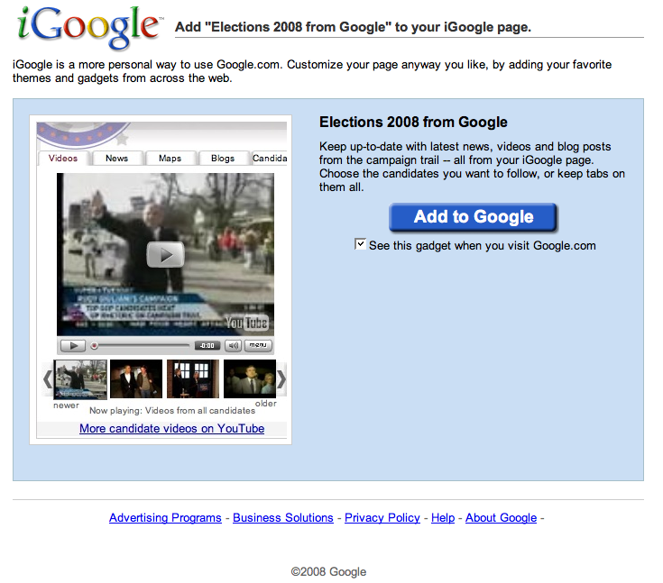 The gadget grabs political videos, news, maps and blogs of candidates from both parties.