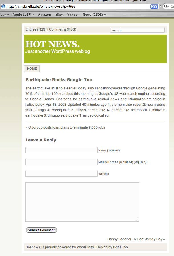 For some reason when I made my post, it took a while to get pulled into blog.search at Google. When it did however, it was under someone elses blog who had in turn stolen all of my headlines and content verbatim.
