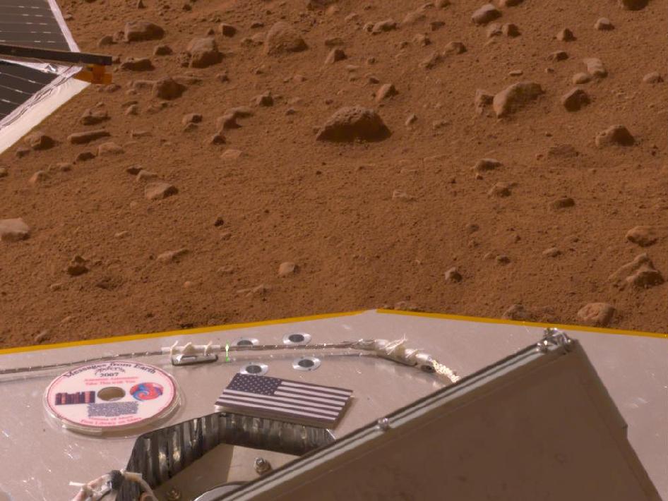This picture shows the American flag and a mini-DVD from NASA’s Phoenix’s deck – 3 feet above the Martian surface. The mini-DVD from the Planetary Society contains a message to future Martian explorers and includes science fiction stories and art inspired by the Red Planet.