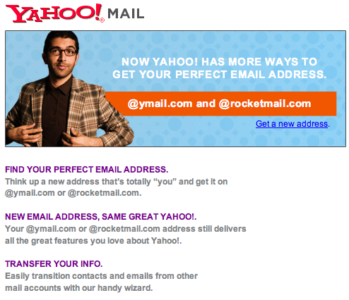Although Yahoo announced new email address availability under their Ymail and Rocketmail domains in June, Yahoo just now appears to be actively promoting them.