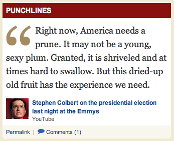 To keep my newly discovered Stephen Colbert blog corps fires burning. here is the most recently known Colbert Quip from last night’s Emmy Awards found via the WashingtonPost.com and their new “Political Browser” News section: