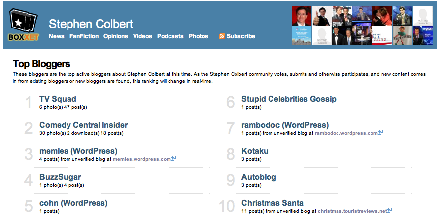 Voila! This blog is now the fifth most popular Colbert blog at Boxxet.
