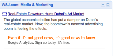 Recently I noticed my Wall Street Journal Media and Marketing feeds have been accompanied by display ads from Google Analytics.