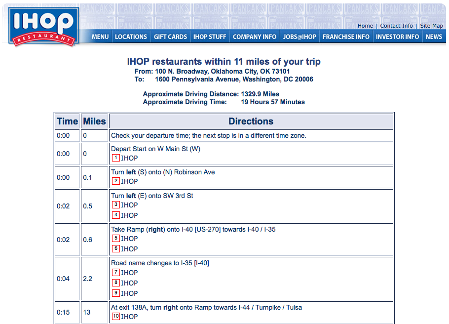 With IHOP’s store location finder and trip planner, pancake searchers should be able to easily locate their next and nearest stack of pancakes anywhere along their travel route.