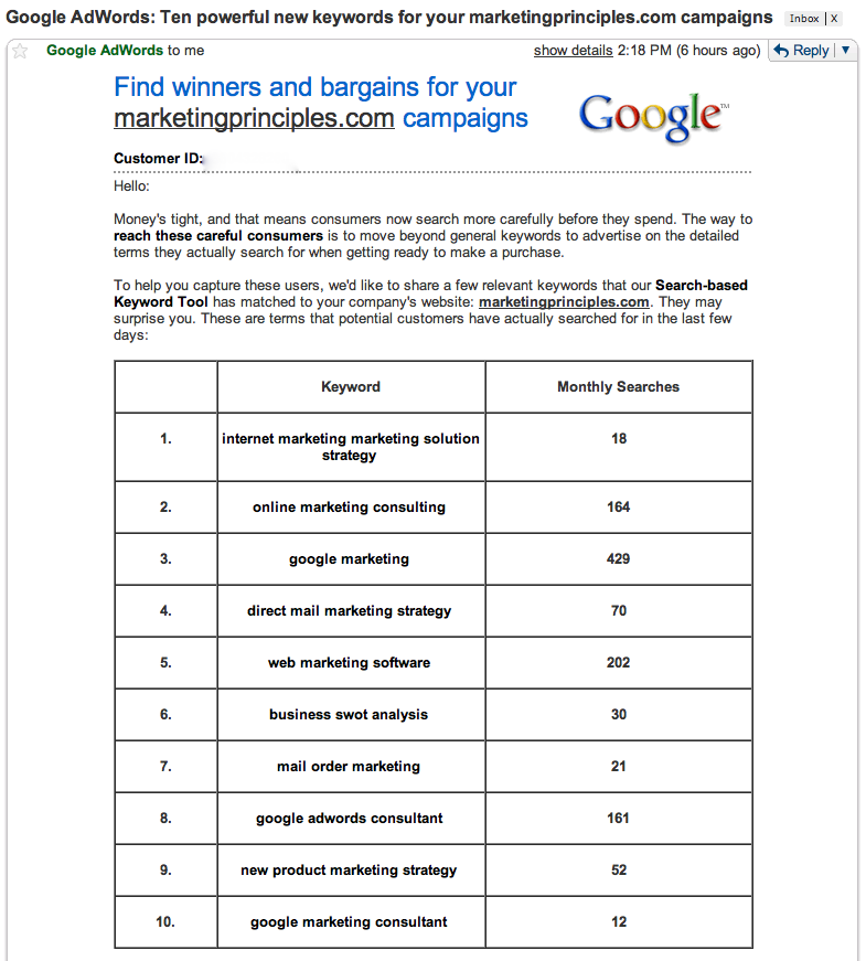 Upon opening the email, I found the following message along with Google Adwords top ten keyword recommendations for my website marketingprinciples.com.