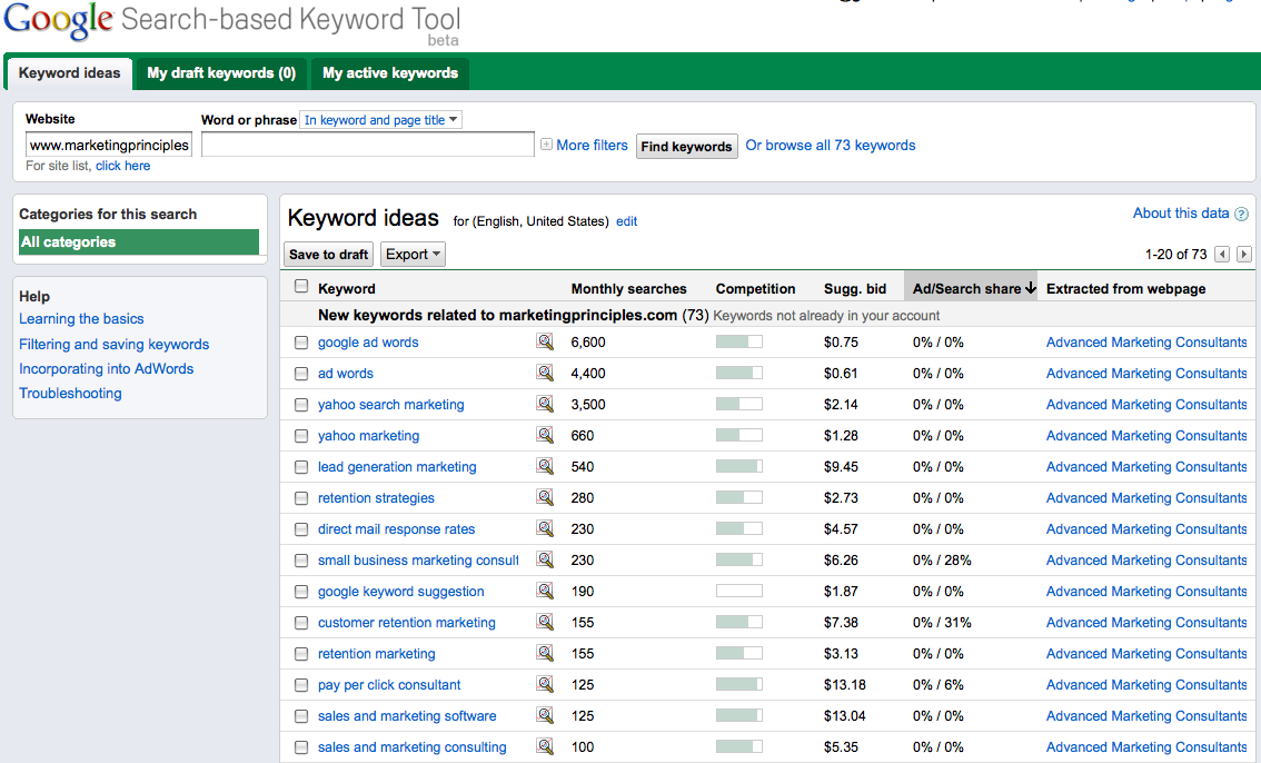 However, the search-based keyword tool produced 73 keywords for marketingprinciples.com not 712.