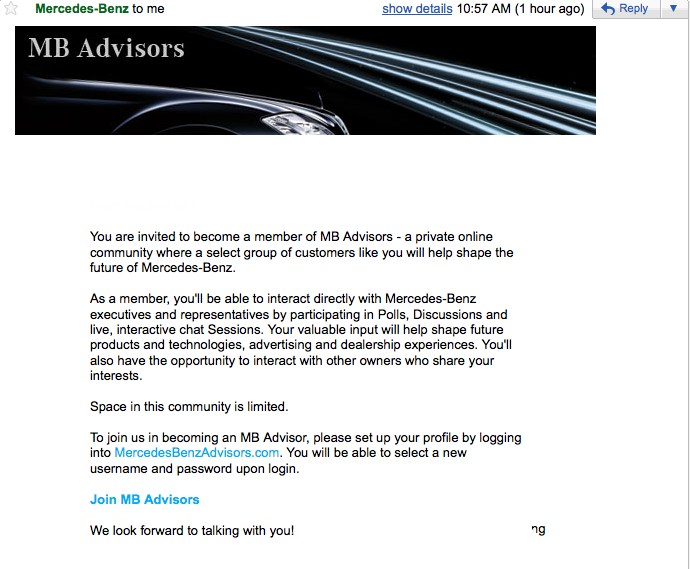 As a loyal customer to many different companies and their brands, the following email is the first I recall ever receiving where a company I have chosen to spend my money with has asked me to participate in their brand’s community.