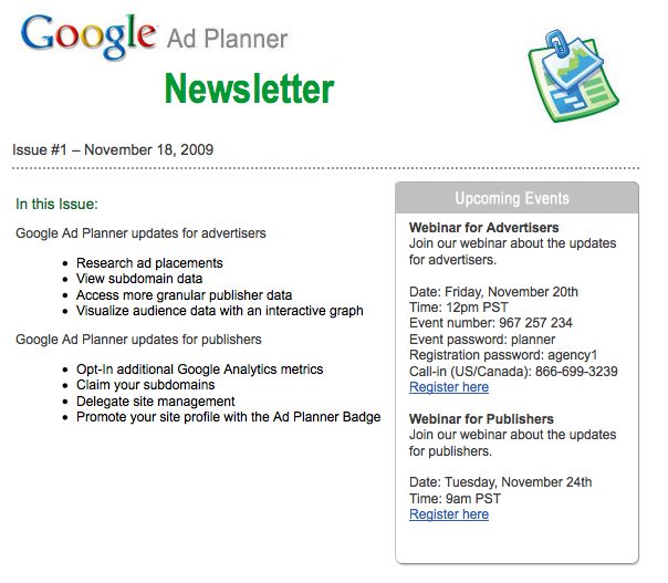 Topics discussed in the first Google Ad Planner newsletter are actually the subject matter of a Google Ad Planner “Webinar for Advertisers” to be held November 20, 2009 @ 12pm PST and again on November 24 9am PST .