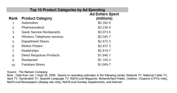 This entry was posted on January 10, 2010 at 8:47 pm and is filed under Top 10 Product Categories By Ad Spending. You can follow any responses to this entry through the RSS 2.0 feed. You can leave a response, or trackback from your own site.