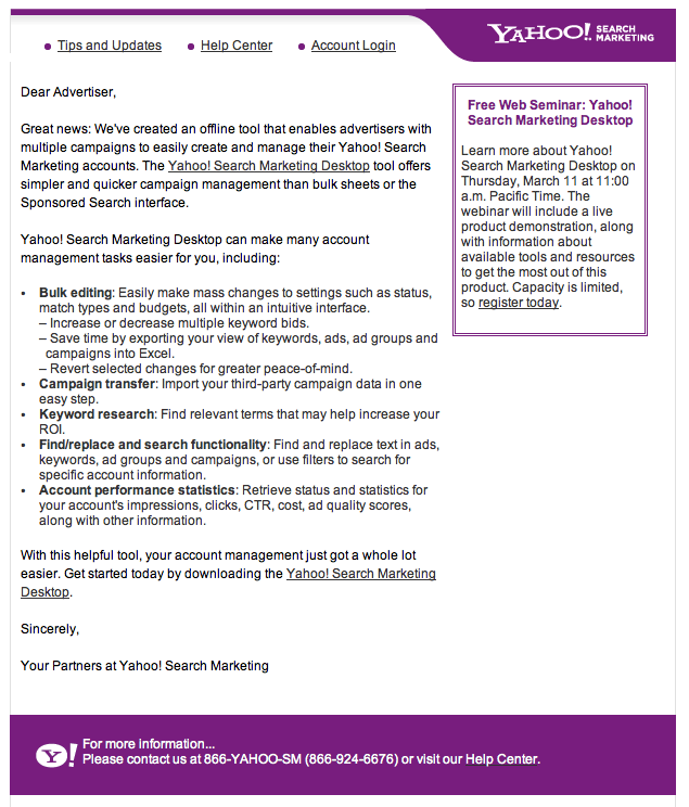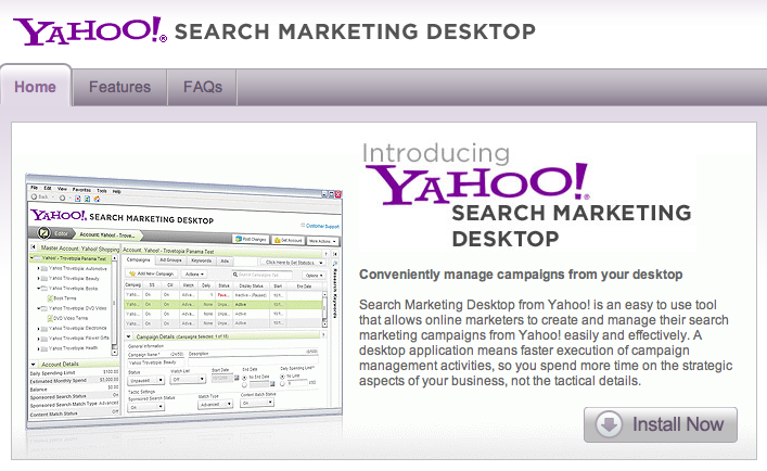 The Yahoo! Search Marketing Desktop tool offers simpler and quicker campaign management than bulk sheets or the Sponsored Search interface.
