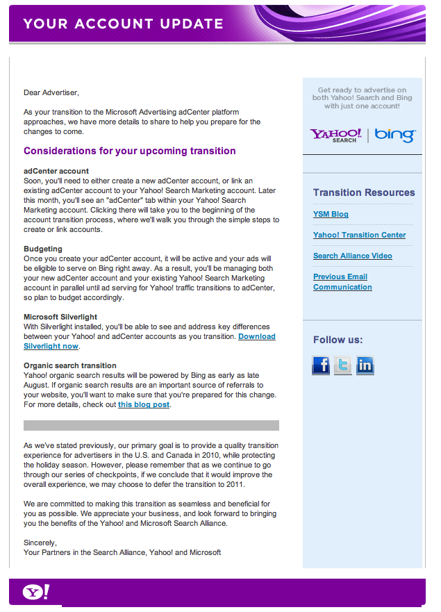 Soon, you’ll need to either create a new adCenter account, or link an existing adCenter account to your Yahoo! Search Marketing account. Later this month, you’ll see an “adCenter” tab within your Yahoo! Search Marketing account. Clicking there will take you to the beginning of the account transition process, where we’ll walk you through the simple steps to create or link accounts.