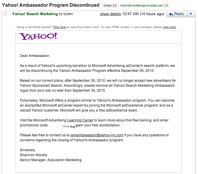 Accordingly, please remove all Yahoo! Search Marketing Ambassador logos from your site no later than September 30, 2010.