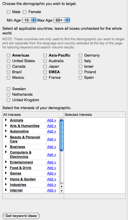 Besides traditional word association keyword generation, YouTube’s tool can analyzes a YouTube video id or url, or provides targeting by demographics.