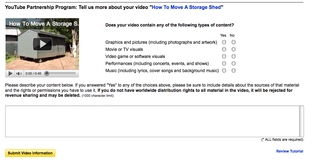 Once a producer has accepted YouTube’s Video Monetization Agreement, they must link their video to a Google Adsense account and then answer some simple questions about their video.