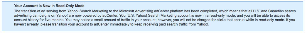 All Yahoo Search Marketing advertisers are now greeted with the following message from Yahoo:
