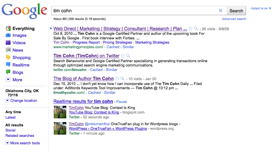 I have determined my posting at least three Tweets in a row activates Google’s realtime search results for a search query with my name in it.