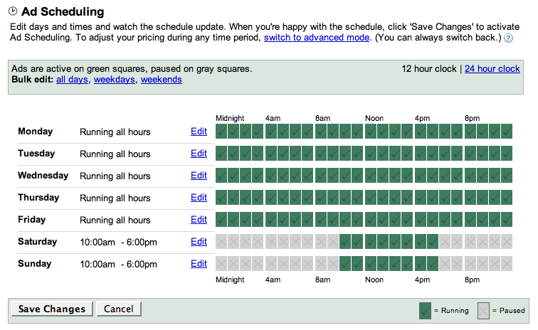 With Google Adwords, you can edit days and times to see how the schedule updates. When you’re happy with the schedule, click ‘Save Changes’ to activate Ad Scheduling. To adjust your pricing during any time period, use the advanced ad scheduling mode.