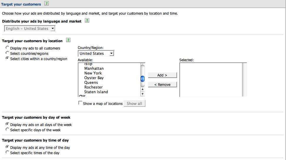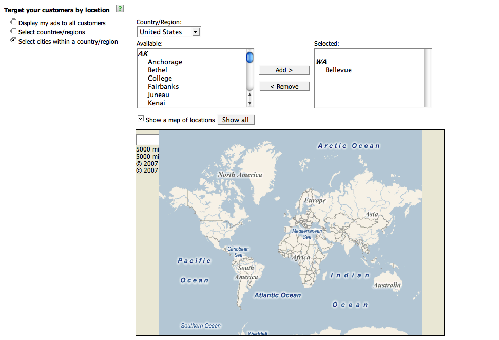 Once a country or region has been selected, advertisers can select a limited number of cities within each state to distribute their ads to.