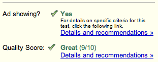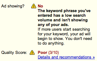Each ad and keyword’s Quality Score shows its status – whether the ads are showing or not as well as its numeric Quality Score.