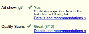 Within the new Adwords Quality scoring system, ads and keywords which score 9 and 8 are considered “Great”.