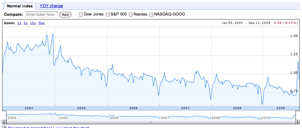 Google Domestic Trends tracks Google search traffic across specific sectors of the economy. The changes in the search volume of a given sector on google.com may provide useful economic insight. We have created 23 indexes that track the major economic sectors, such as retail, auto and unemployment. Each index value is baselined at 1.0 on January 1, 2004 and is calculated and displayed on the Google Finance charts as a 7-day moving average. You can easily compare actual stocks and market indexes to these Google Trends on the charts.