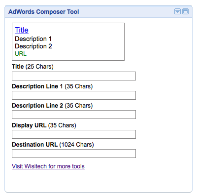 Tags:Adwords, Adwords Composer Tool, Editors Picks, External Keyword Suggestion Tool, Gadget Search, Google, Google Adwords Tools, iGoogle Widgets, Text Ad, Wisitech