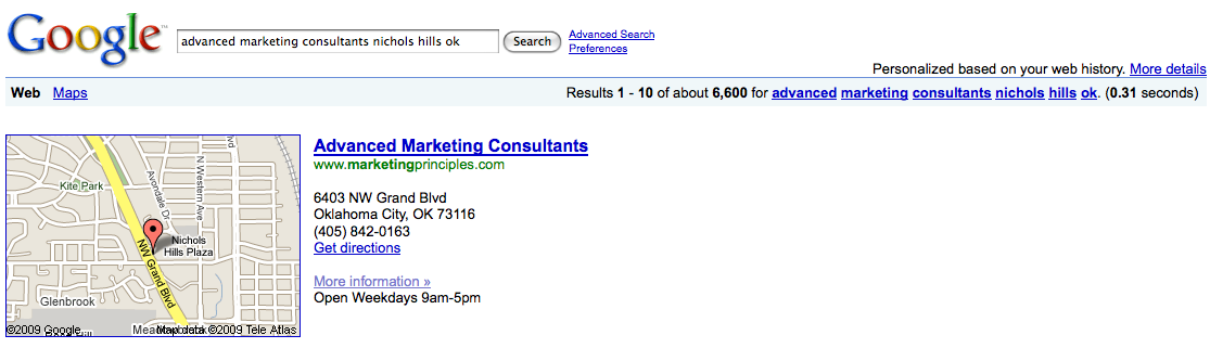 Once my Local Business Center listing even appeared inexplicably atop a Google Maps search for “marketing consultants”.