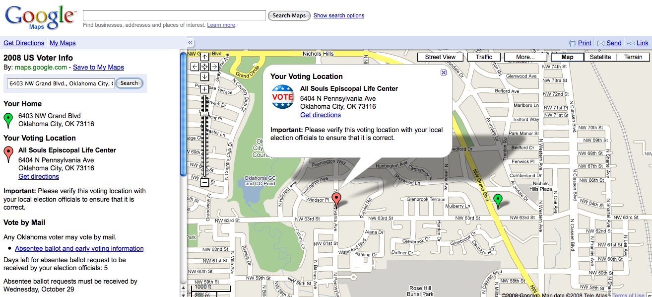 The first link took me to Google Maps and their 2008 US Voter Information search box. Here visitors can find their neighborhood voting location by entering their home address.