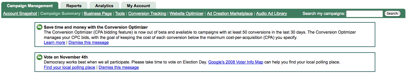 Today when I was logging into my Google Adwords account, I received the first non Google message I can ever remember receiving in My Client Center: “Vote On November 4th.”