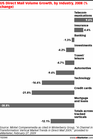 Additionally, Mintel Comperemedia found that the volume of direct mail among the leading vertical industries fell an average of 12.1% in 2008.