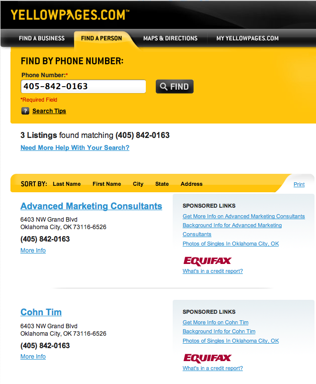A search for the service (business marketing) and the location (Oklahoma City) produces a different yet seemingly innocuous list of businesses. However, in this particular query and in addition to the expected listing for my business “Advanced Marketing Consultants” appearing, “Cohn, Tim” also appears as one of the results.