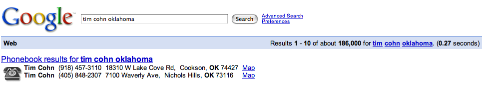 Yet, a search in Google for “Tim Cohn Oklahoma” produces both of my residential phone numbers and listings in correct order: Tim (first name) and then Cohn (last name) –