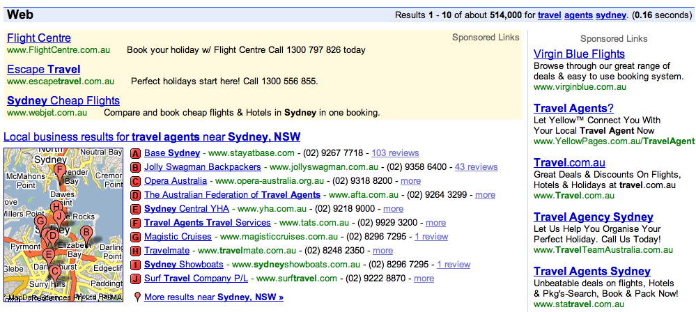 This search in Sydney, Australia for travel agents also produces a OneBox result. Here the OneBox appears again at the top of the page above the organic results.