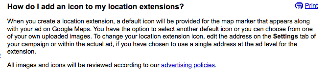 Searching within Adwords help, I found the following explanation on how to add an icon to a location extension.