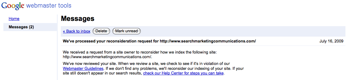 I did however decide to take their advice and use Google Webmaster Tools message center to contact Google and ask for a review of my site.