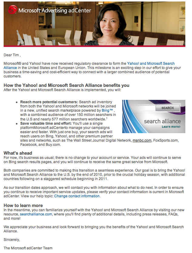 We appreciate your business and look forward to bringing you the benefits of the Yahoo! and Microsoft Search Alliance.
