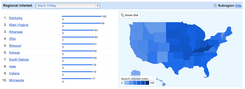 Regional search interest in Black Friday appears greater from within the central United States than from states on either the East or West coasts.