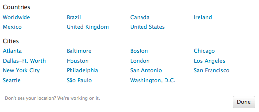 Twitter presently offers their location service at a Worldwide level or at the country level for Brazil, Canada, Ireland, Mexico, United Kingdom and the United States.