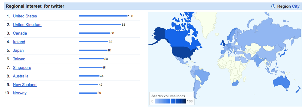 Interestingly, searches for Twitter over the last 12 months show slightly increased interest from Canada, Australia and New Zealand with less search activity coming from Norway.