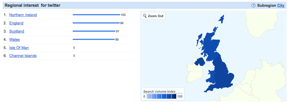Use Google Trends Insights for Search to further explore where Twitter is most searched for in the United Kingdom or in your particular corner of the world.