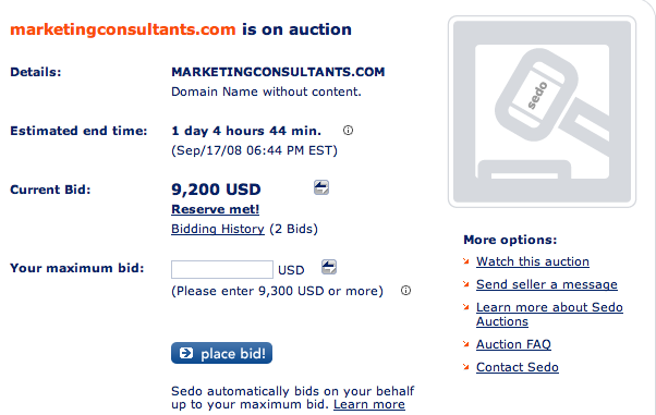 [ Considering I bought marketingconsultants.org for $7.41, I am having a hard time justifying entering a domain auction for the same domain albeit with the superior extension at over 1,300 times the price I paid for mine.