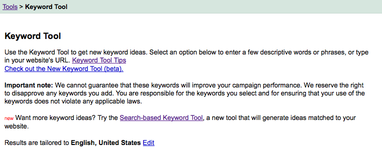 Clicking on Keyword Tool under the Opportunities tab in an Adwords account takes advertisers to an internal page with a Check out the new Keyword Tool (Beta) link.