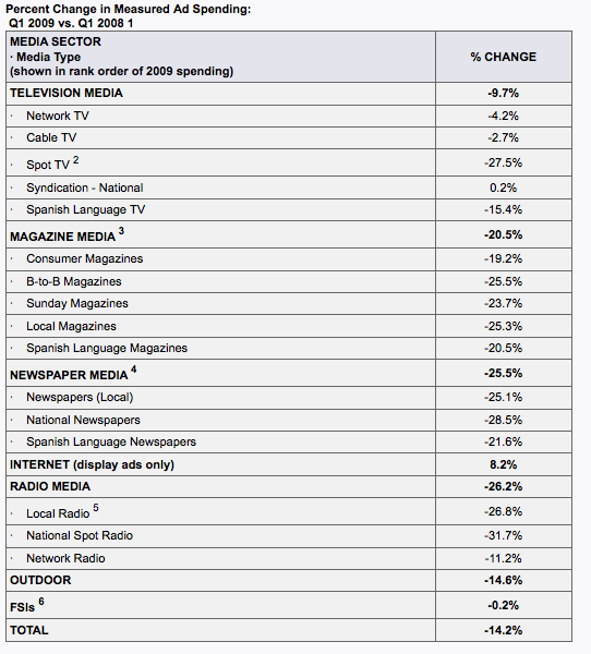TNS Media Intelligence reports U.S. Advertising expenditures declined 14.2% in the first quarter of 2009.
